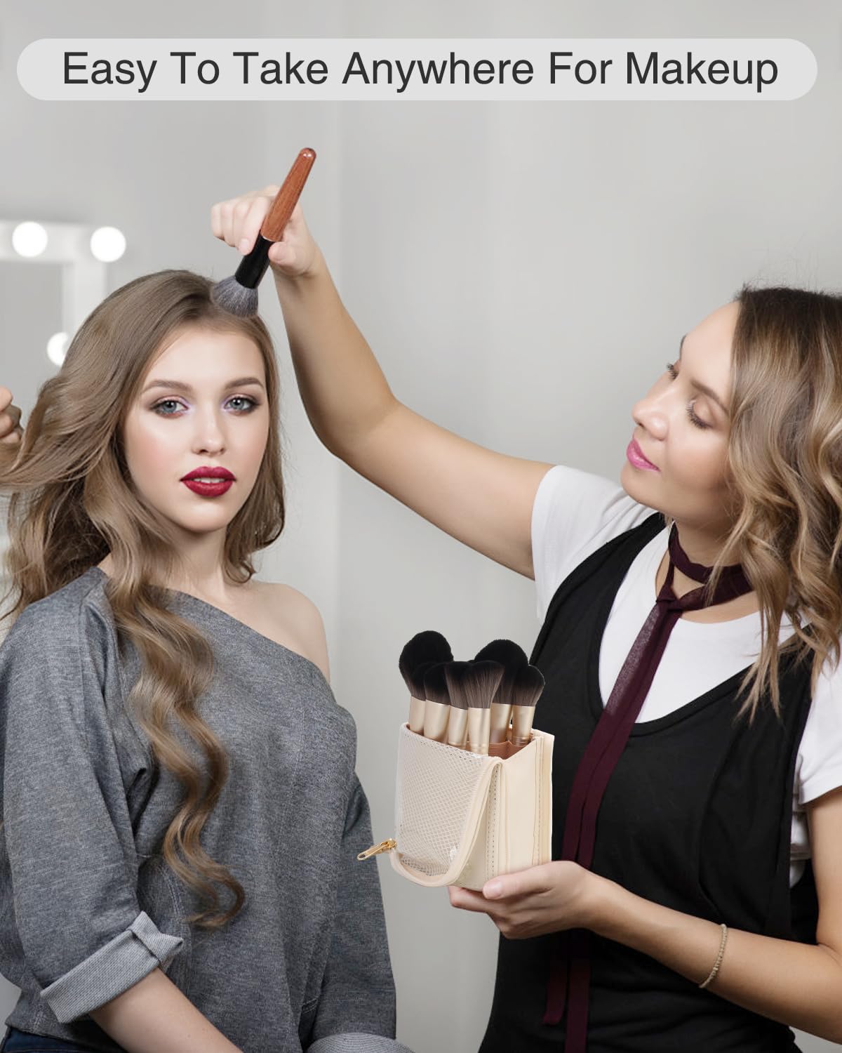 This makeup brush bag is functional,You don't need to buy a makeup brush case and a makeup brush holder two kinds product,only need one bag.This makeup brush bag can be carried anywhere and any time.