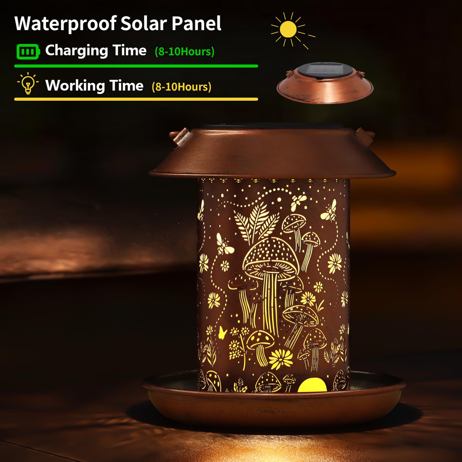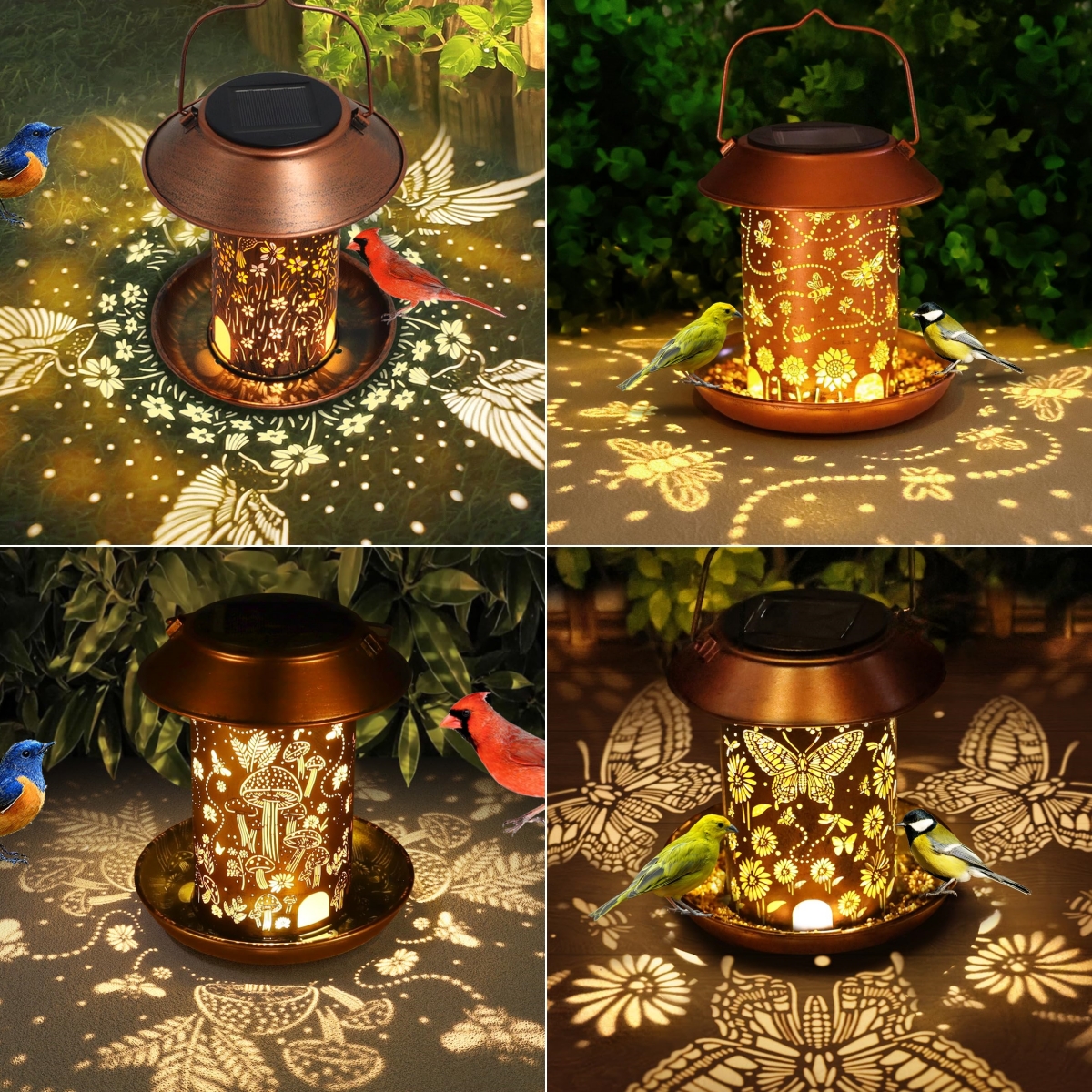【Solar Bird Feeders for Garden】The hollow design of the solar light projects beautiful patterns of hummingbirds, butterflies, bees, and mushrooms, adding a vivid touch to your garden. It is not only a bird feeder but also a solar garden lantern, making it a perfect gift choice.